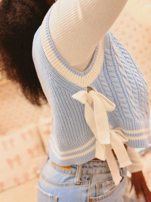Soft as a cloud and sweet as sugar — the Bow Belle sweater vest is a pastel-perfect piece made for the girly girls at heart. In the dreamiest shade of light blue, this cozy knit features an elegant V-neckline and darling bow accents that flutter with charm and femininity.